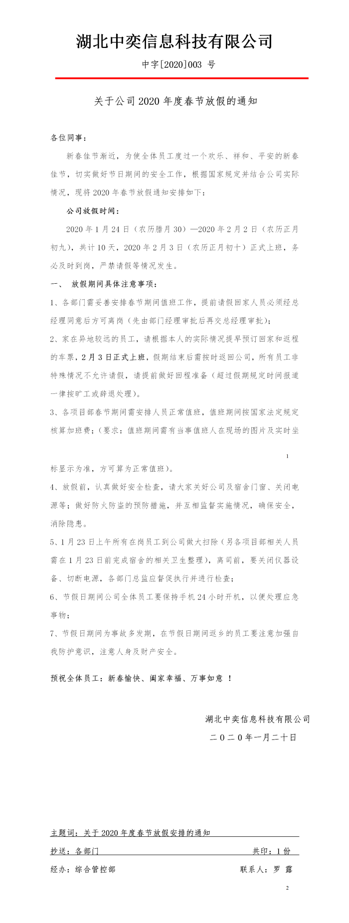 2020-003-关于公司2020年度春节放假的通知